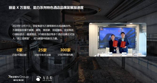 2024年12月31日,丽呈集团与万喜程股份在携程上海总部签约战略合作,双方开始全方位战略合作发展潮浸、CJ潮际、潮扉、豪致、豪雅、雅丽豪、程迹、FO精舍、G次元全矩阵品牌。